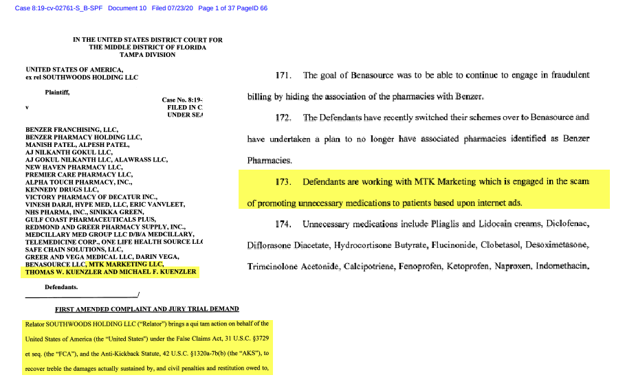 - (Special Analysis: Why were Michael and Thomas Kuenzler defendants in “USA ex rel Southwoods Holdings LLC vs “….a lot of pharmacy companies and marketing firms, including MTK Holdings owned by the Kuenzlers”