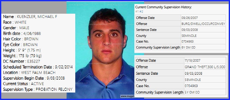 Michael Kuenzler is placed on probation after being found guilty of Felony Burglary of an Occupied Dwelling and Grand Theft. He was sentenced to six years probation and does not appear to have served any jailtime as he was sentenced under the Youthful Offenders act due to the crime being committed in 2007 when Kuenzler was months shy of his 18th birthday. (CASE NO: 592007CF004963B)