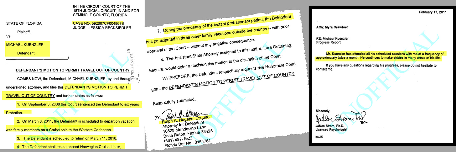 - MICHAEL KUENZLER via HIS DEFENSE ATTORNEY FILES A MOTION TO PERMIT TRAVEL OUT OF COUNTRY (PROHIBITED AT THE TIME DUE TO HIS STATUS AS A FELON ON PROBATION) SO HE CAN ATTEND A FAMILY VACATION ON A NORWEGIAN CRUISE TO THE WESTERN CARIBBEAN. The motion was filed by his Defense Attorney, Ralph A. Hagans. His lawyer indicates in the motion that the court has already permitted Michael Kuenzler to attend family vacations outside of the country on three previous occasions (Analyst Note: We find this to be a bit shocking as he would have only been on probation for less than two years and this would be his fourth “vacation” from probation despite having committed two serous crimes at the felony level). The filing also contained a “Progress Report” from Kuenzler’s Psychologist, JaNon Strom which stated that he has seen her twice a month and “continues to make strides in many areas of his life.” (CASE: 50-2009-MM-003971-AXXX-SB)