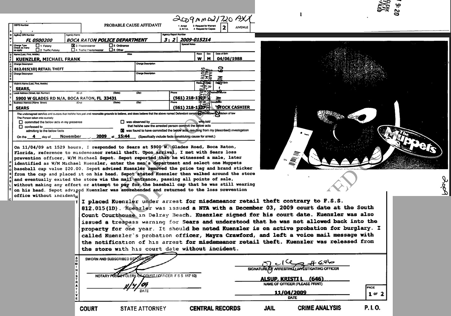 MICHAEL KUENZLER IS ACCUSED OF SHOPLIFTING WHILE ON PROBATION FOR BURGLARY AND LATER ARRESTED FOR VIOLATING THIS PROBATION. While at a SEARS retail store, Kuenzler had removed the price tags of a $20 “Muppets” baseball cap and left the store where he was subsequently apprehended by the Loss Prevention Officer. (CASE NO: 502009MM021720AXXXSB)