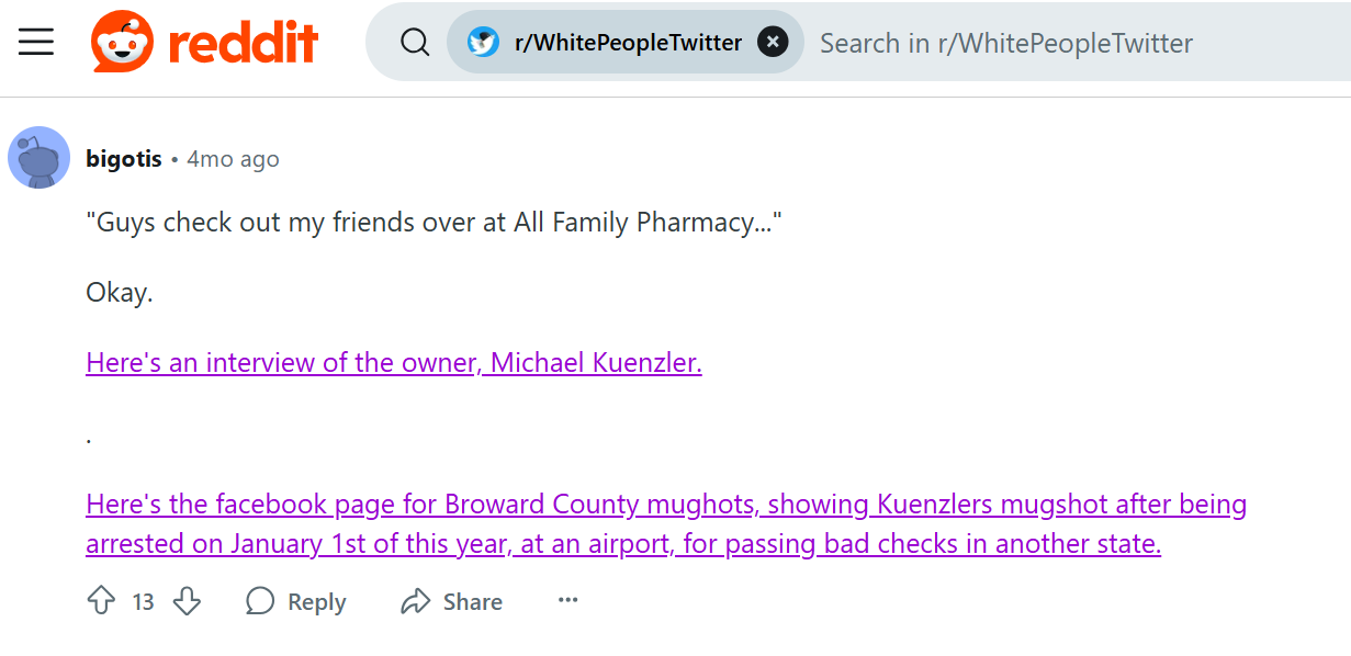 While performing public due diligence on All Family Pharmacy (“AFP”), Consumer Diligence started finding a lot of criminal and civil court cases that we thought we should share with our fellow consumers. Though checking for criminal records and files related to a subject is a normal part of our Public Due Diligence process, we refocused on this area of research when a booking photograph (aka “mugshot”) of a “Michael F. Kuenzler” appeared in a social media posting that came up in our feed: