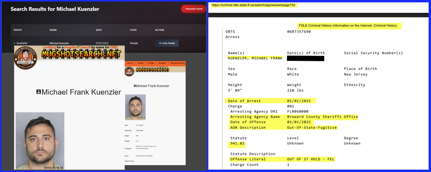 A search for “Michael Kuenzler” on FDLE confirmed some of the information published on the mugshotsearch.net website but also revealed additional criminal charges and complaints dating back to 2008. These charges and/or convictions included the January 2025 incident we had been looking for. There was a confirmed arrest and Out-of-state Fugitive hold by law enforcement of Michael Kuenzler of January 1, 2025, though nothing on this official record made mention of why Kuenzler was being held as a fugitive. However, this record from FDLE did indicate that whatever the reason he was held, it was for a felony level charge, as indicated by the “FEL” contained within the charge.