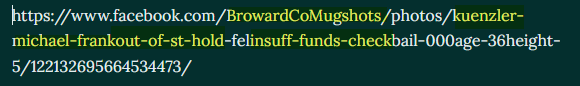 Analyst Note: The original Facebook url seems to indicate that there was a mugshot of Michael Kuenzler that had previously been contained in the referenced post with keywords within the url that reference a mugshot, Broward County, Michael Frank Kuenzler, “Out-of-state-hold”, insufficient funds and “check” and “Age 36”: