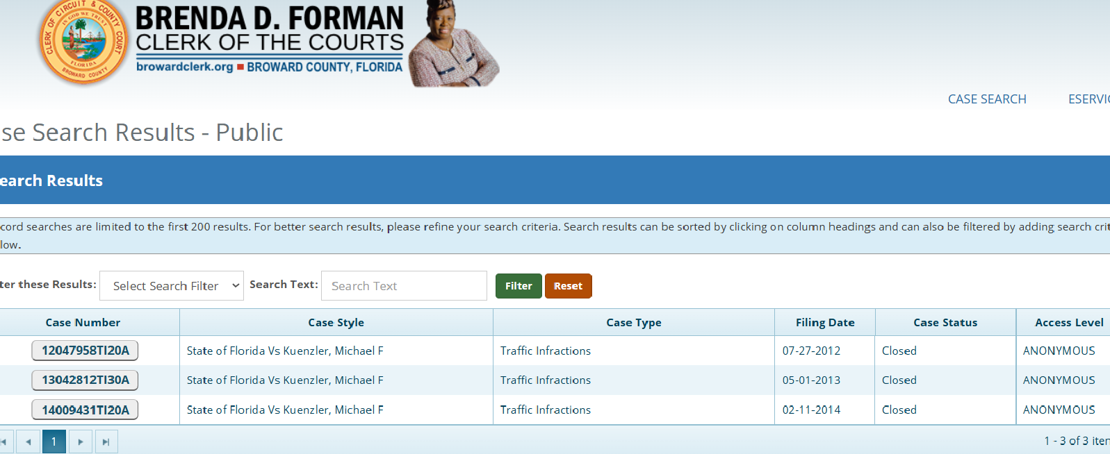 From here we went to the Broward County Courts official page. Again, a search for cases with the last name “Kuenzler” did not yield any results related to the January 1, 2025 “Hold” of Michael Kuenzler as an Out-of-State fugitive, but it did yield three traffic infractions which were relatively minor but provided important identifying information to assist us in our searches across official public websites: