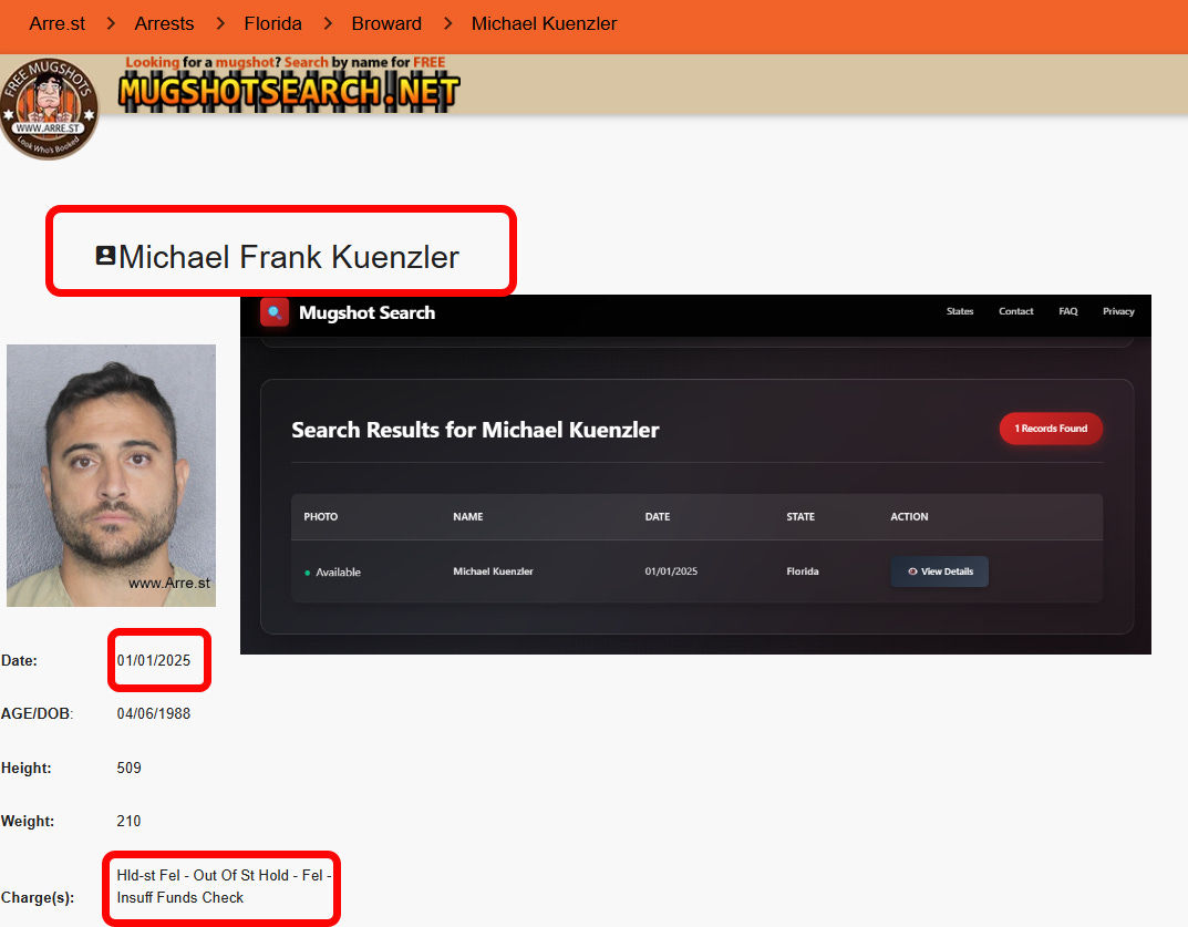 here's the Facebook page for Broward County mugshots, showing Kuenzlers mugshot after being arrested on January 1st of this year, at an airport, for passing bad checks in another state.”