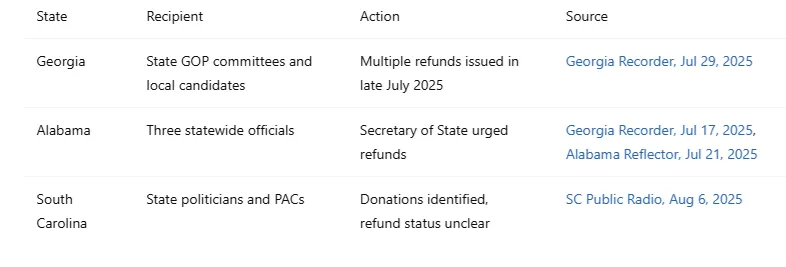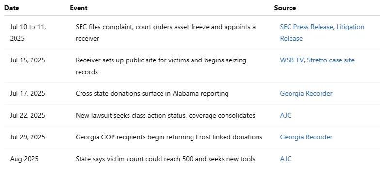 Though based in Georgia, the Frost network reached into Alabama and South Carolina, with donations and ties across state lines (Georgia Recorder, Jul 17, 2025, SC Public Radio, Aug 6, 2025).