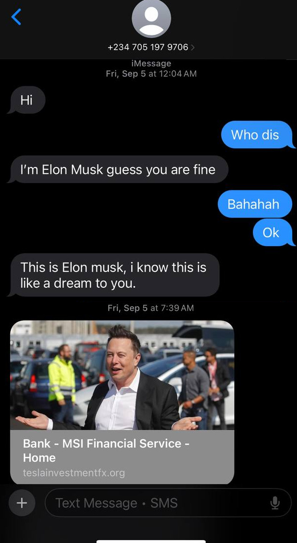 Amid online attacks for this work, an X account claiming to be Musk approached, offering “life-changing capital” through Tesla investments.